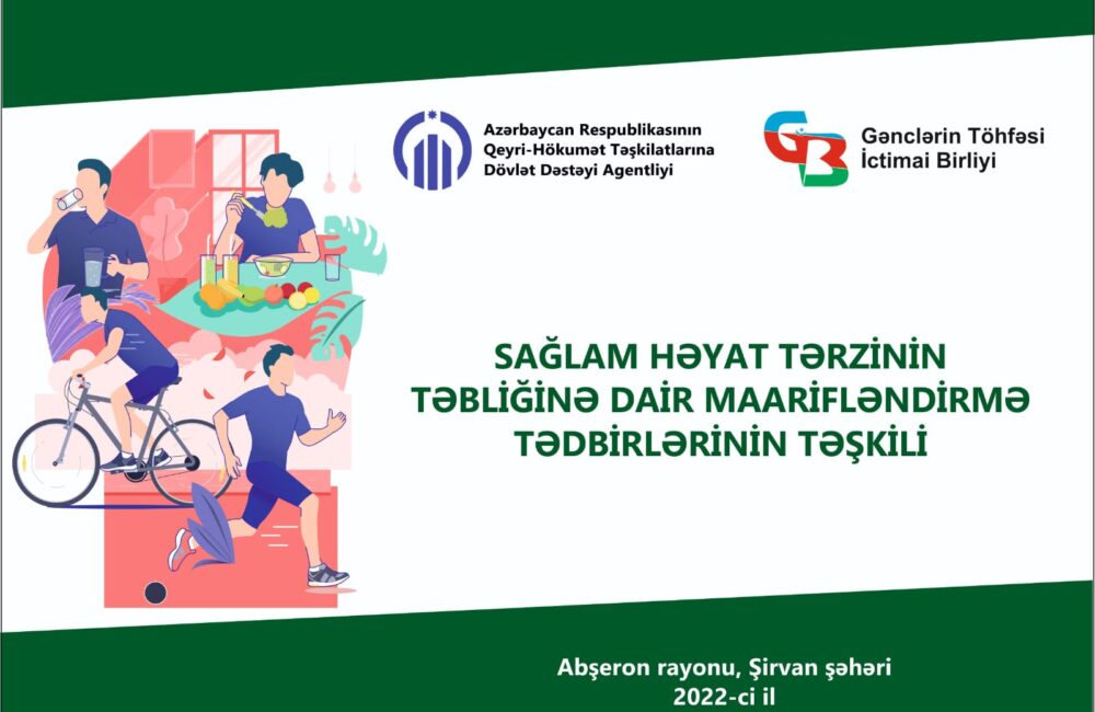 Məlumat üçün bildiririk ki, “Gənclərin Töhfəsi” İctimai Birliyinin təşkilatçılığı, Azərbaycan Respublikasının Qeyri-Hökumət Təşkilatlarına Dövlət Dəstəyi Agentliyinin maliyyə dəstəyi ilə “Sağlam həyat tərzinin təbliğinə dair maarifləndirmə tədbirlərinin təşkili” adlı layihənin icrasına başlamışdır. Layihənin məqsədi yeniyetmə və gənclərin zərərli vərdişlər və qeyri sağlam şəkildə qidalanmanın səbəb olduğu acımasız xəstəliklərdən, gəncləşən ölümlərdən xilas olmaq üçün zərərli vərdişlərdən çəkindirmək, mübarizə imkanları, sağlam qidalanma və düzgün həyat tərzilə əlaqədar olaraq geniş şəkildə maarifləndirməkdən ibarətdir.
